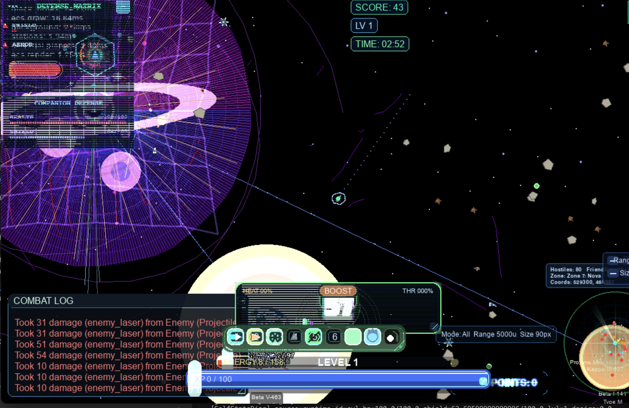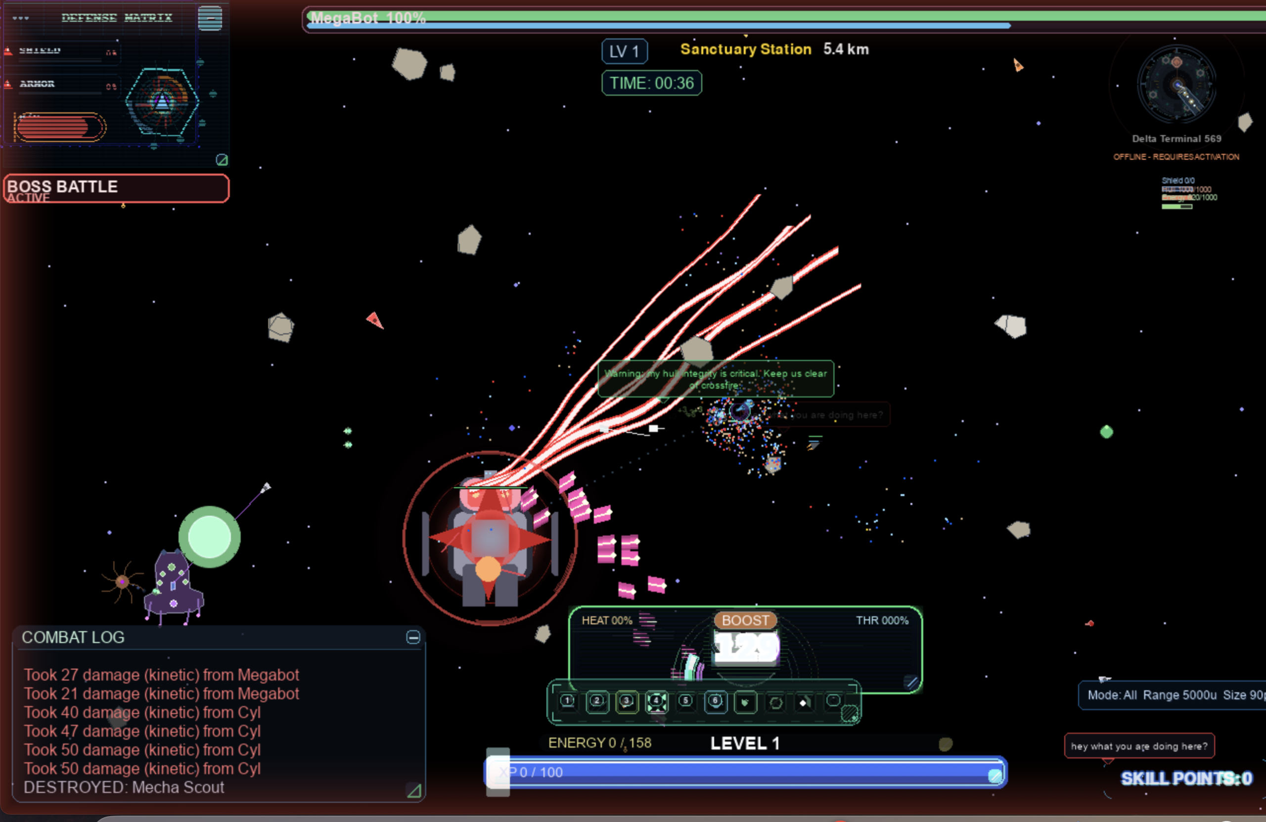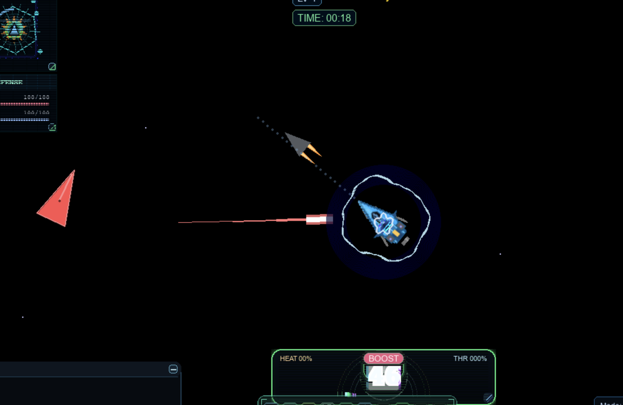 Your missiles, lasers, and other abilities are all influenced by momentum. The play style is very different because of this, especially at the beginning of the game. As you level up, the laser gets faster, and easier to use. Try the dual lasers in the character menu by pressing ‘c’ whilst playing!