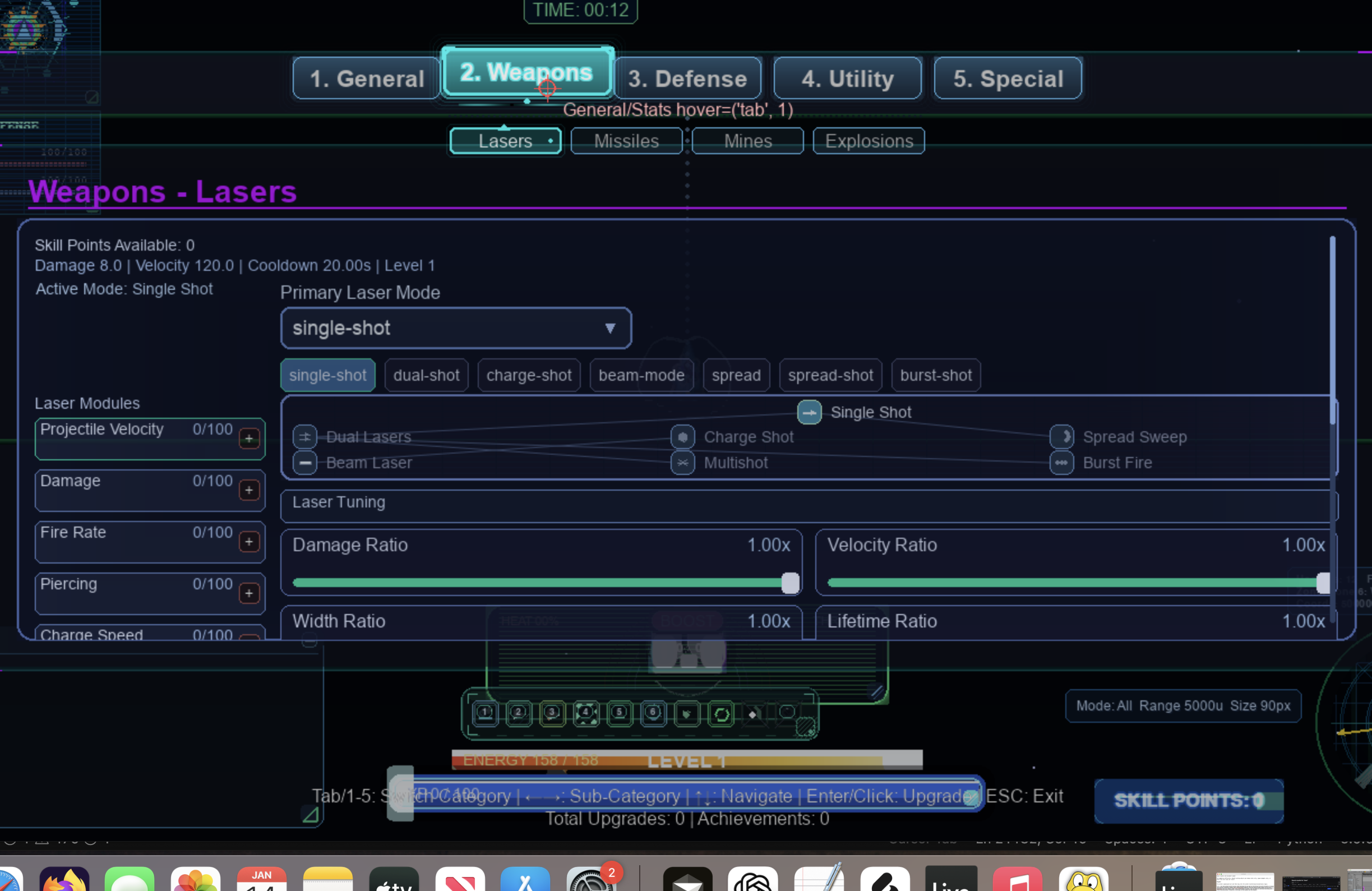 You buy and level up abilities with skill points. There are a lot of skills to buy, and the weapons are the most reliably implemented so far, especially the lasers. I am in active development on all weapons, as well as an advanced targeting system that should be coming out as part of the DEMO in 2 months.